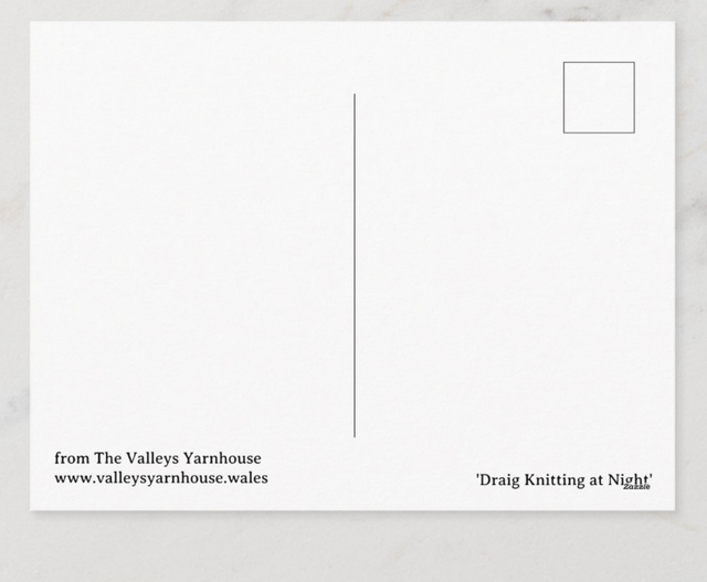 Our own 'Draig Knitting at Night' image printed here at the Yarnhouse on a high quality 120 lb weight Soft white, soft eggshell texture Postcard. With address details and note space on the reverse.