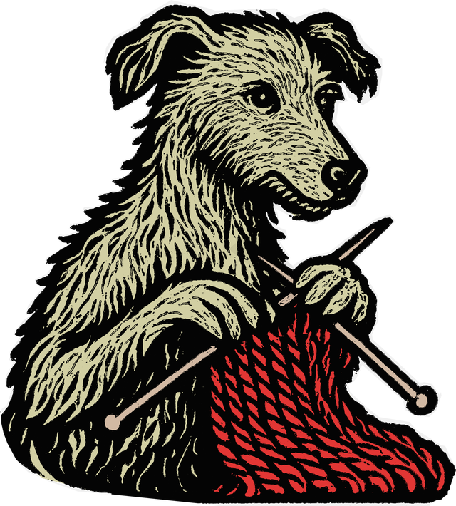 An acrylic & enamel clutch pin badge of our lurcher hound 'Draig' knitting as he does on our logo. The perfect addition to share your love of knitting, dogs, or simply to say you're supporting our work in building yarn-craft communities!