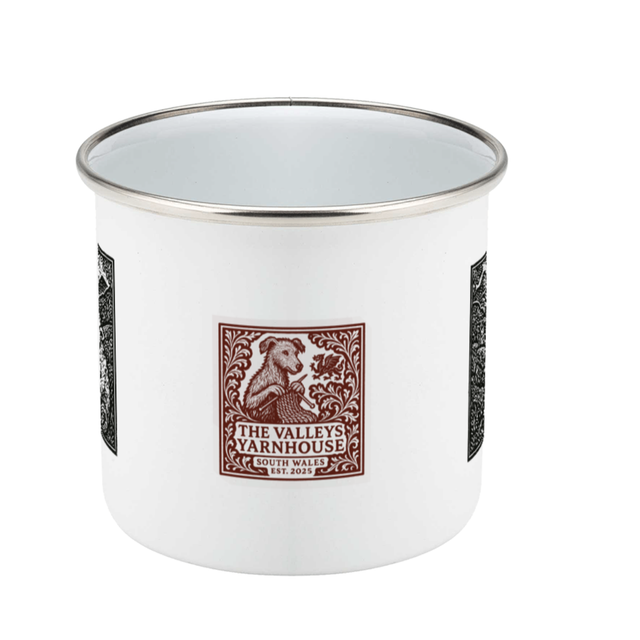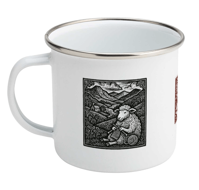 One of our own design mugs featuring Lino-cut artwork of a sheep happily knitting on the welsh valley sides.