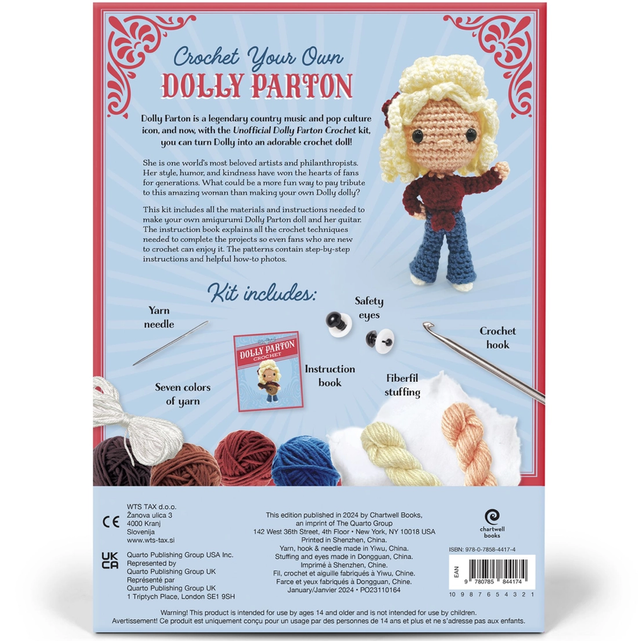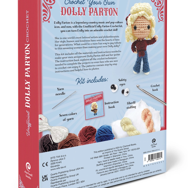 The crochet instruction book includes everything you need to know to make your own amigurumi Dolly Parton doll and her guitar. The pattern contains step-by-step instructions and helpful how-to photos and explains all the crochet techniques needed to complete the project so even fans who are new to crochet can enjoy it.