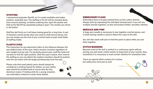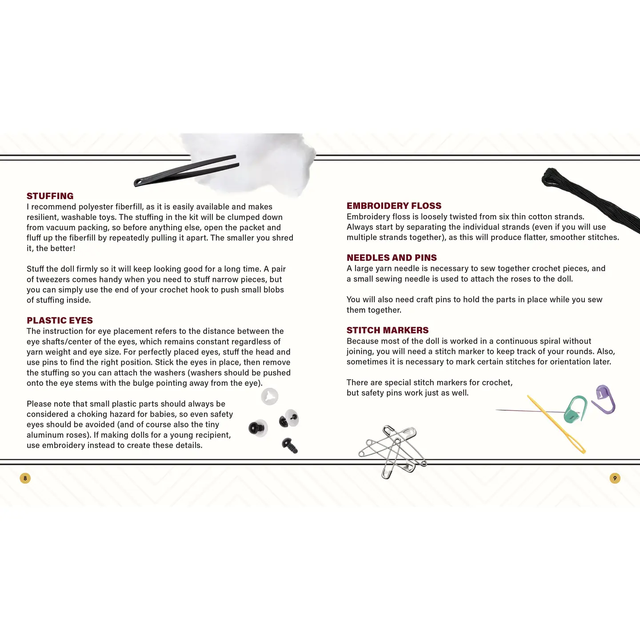 First, learn or review the crochet techniques used in the project, with the included instruction book. Next, follow along with the step-by-step pattern instructions and helpful how-to photos to create your mini Selena.