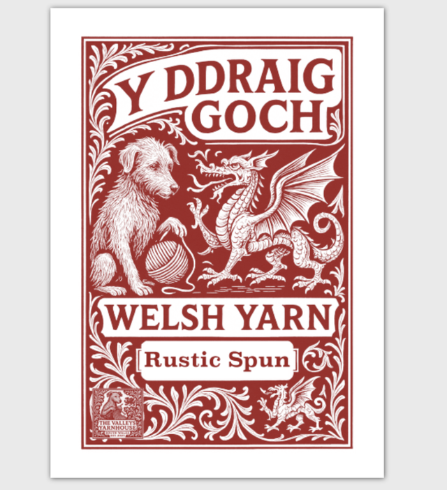 Our Y Ddraig Goch - The Red Dragon - yarn label as a postcard.